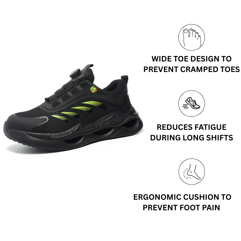 Our shoes are built with reinforced stitching, abrasion-resistant mesh, and a Kevlar midsole. They're made to handle concrete, mud, and harsh site conditions without falling apart.